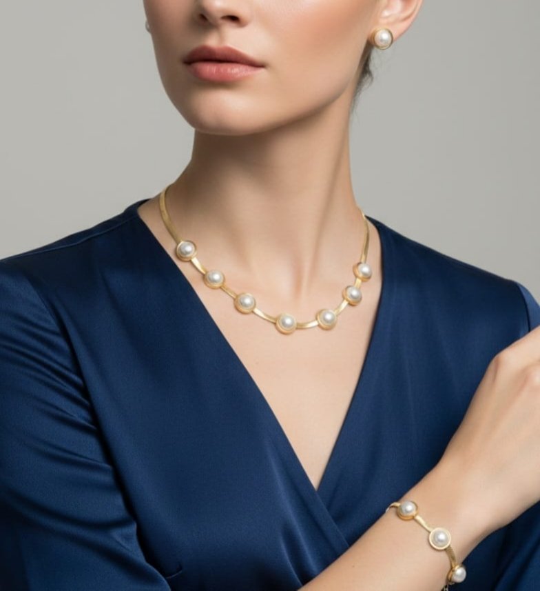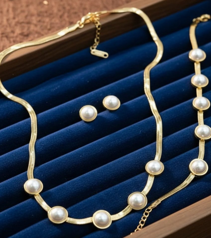 Elevate your everyday elegance with this gold-plated stainless steel pearl jewelry set, designed for timeless sophistication and modern durability. Featuring a sleek snake-style chain adorned with evenly spaced round pearls, this necklace delivers a refined, minimalist look that pairs effortlessly with both casual and formal outfits.