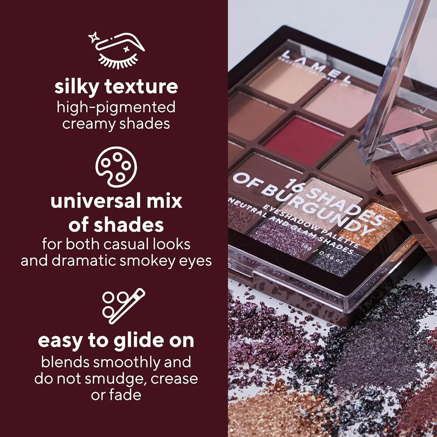 Discover effortless beauty with the Lamel 16 Shades of Burgundy Eyeshadow Palette, thoughtfully curated to eliminate the guesswork of shade pairing. This versatile palette features 16 perfectly coordinated hues in rich burgundy tones, designed to help you create everything from soft daytime elegance to bold, glamorous evening looks.