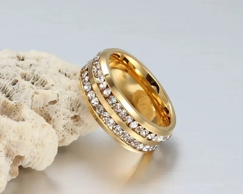 The wide band design offers a modern, sophisticated look, making it perfect as a wedding band, anniversary ring, or premium fashion accessory. Whether worn alone or paired with other jewelry, this ring adds timeless glamour and refined elegance to any occasion.
