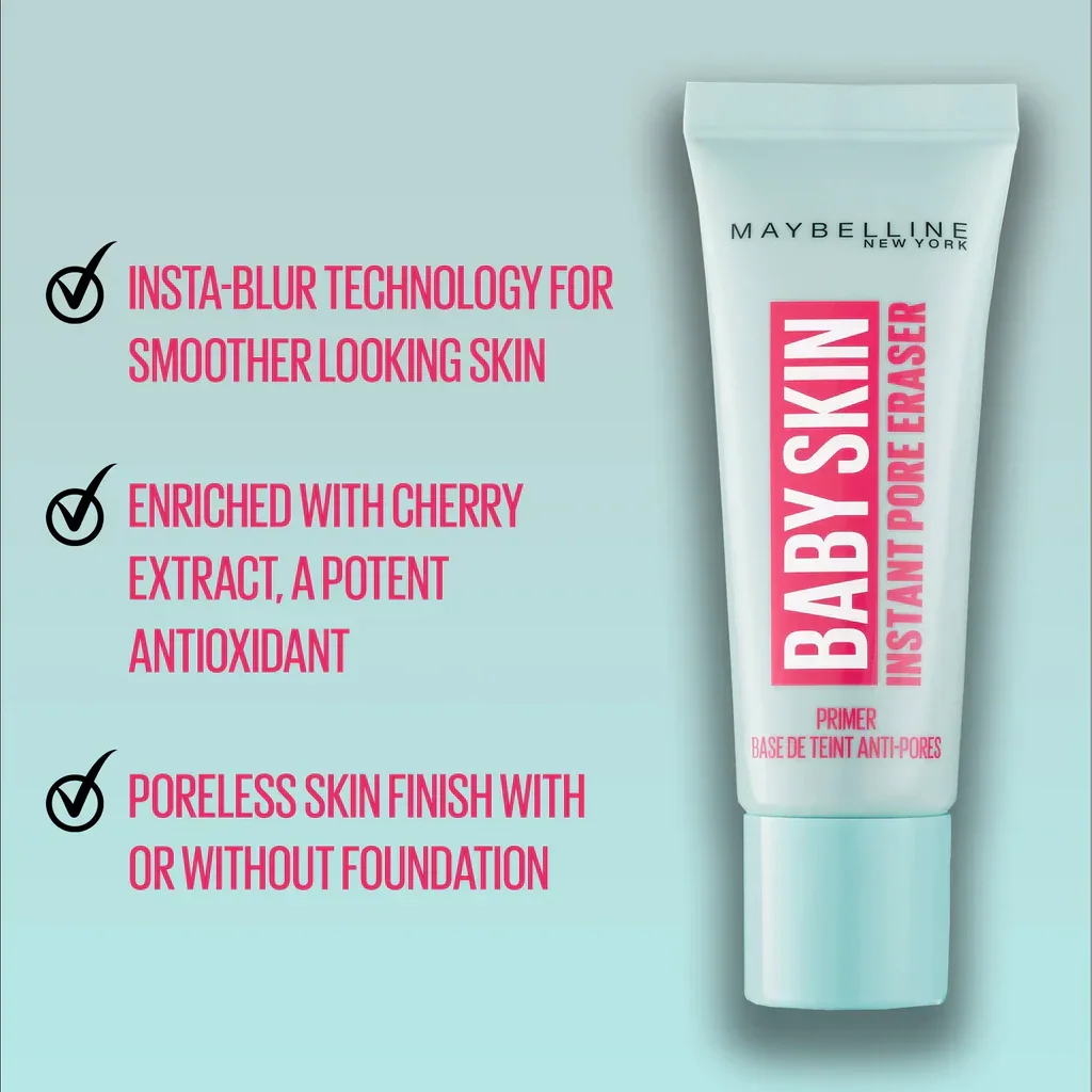 Achieve a flawless, smooth base with Maybelline Baby Skin Instant Pore Eraser Primer. This lightweight, breathable formula instantly blurs the appearance of pores and fine lines, leaving your skin with a soft, matte finish. Designed for everyday comfort, it is non-comedogenic and fragrance-free, making it suitable for all skin types. Wear it alone for a naturally smooth look or under makeup for long-lasting perfection.