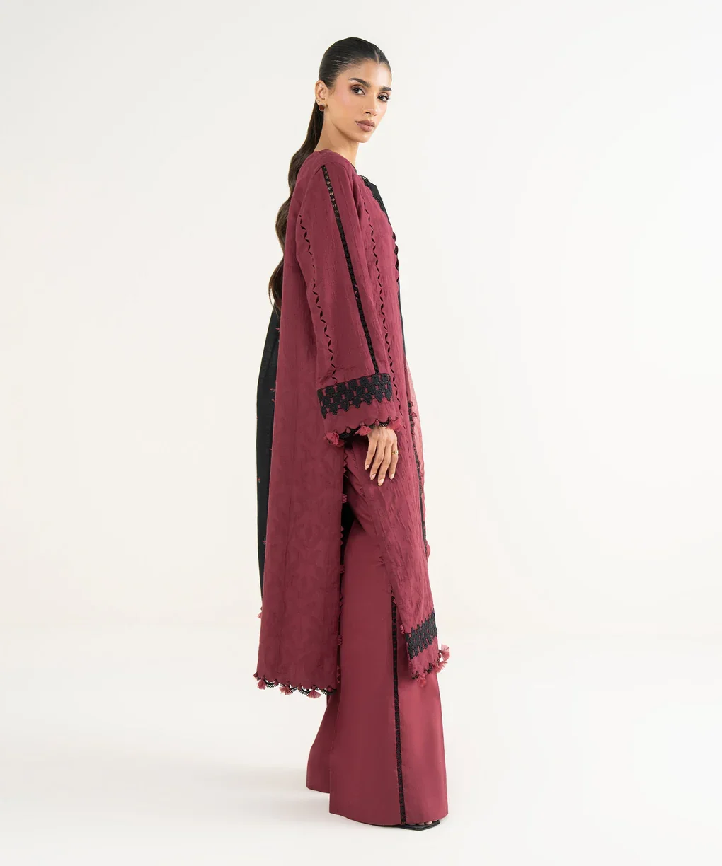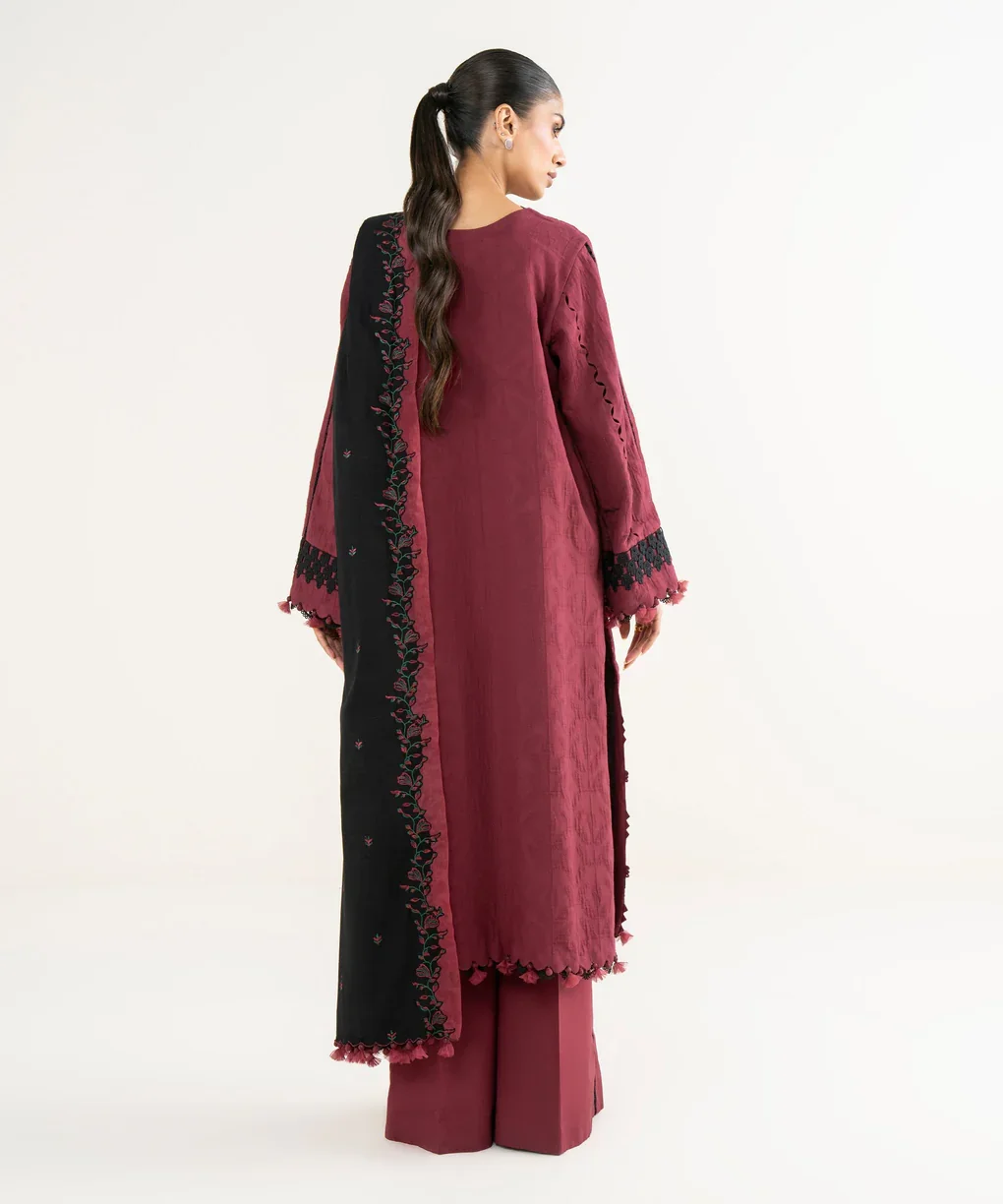 Elevate your wardrobe with this elegant Sapphire 3-piece embroidered suit, designed to make a refined style statement. The richly detailed maroon and black cotton jacquard shirt features delicate embroidery that adds depth and sophistication to the look. Paired with comfortable cotton trousers, this ensemble offers both style and ease for all-day wear. Completing the outfit is a lightweight khaddar dupatta that brings balance and grace to the overall design. Ideal for casual gatherings, festive occasions, or semi-formal wear, this suit blends timeless charm with modern elegance.