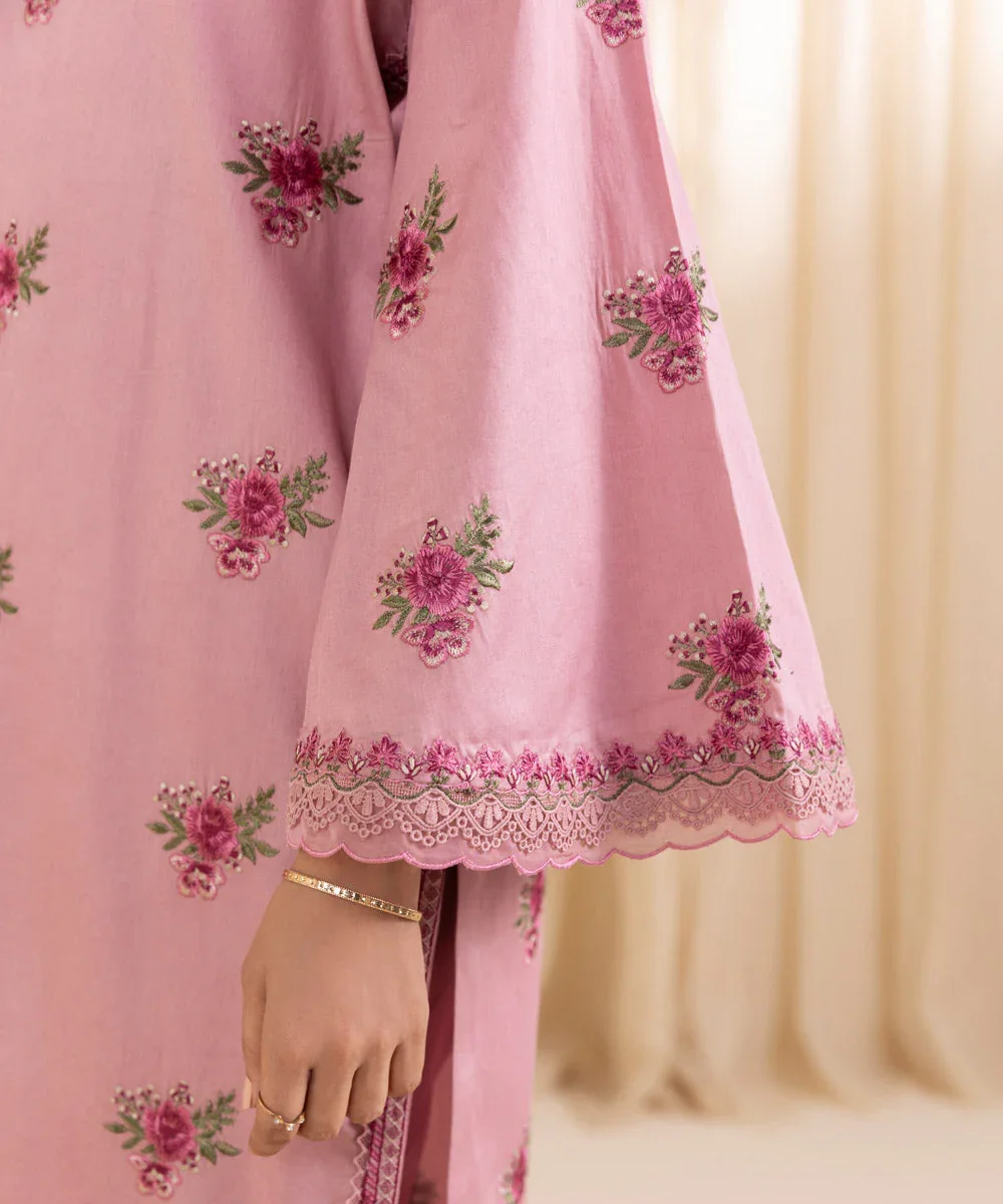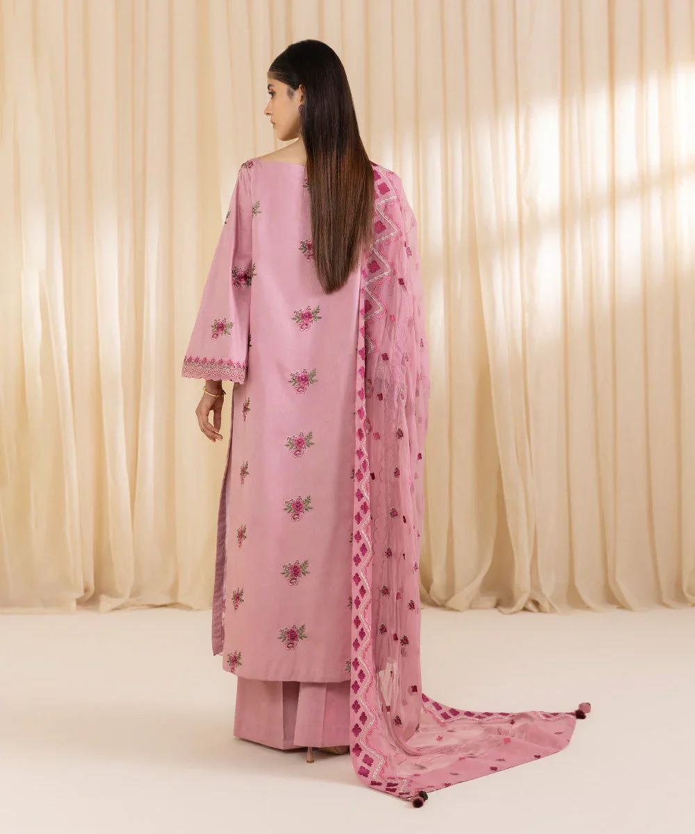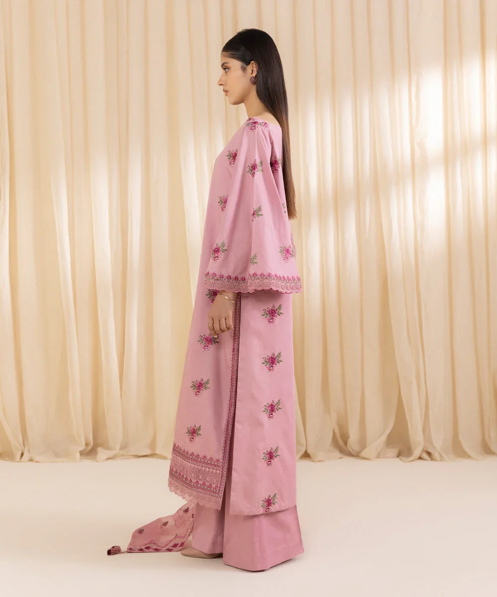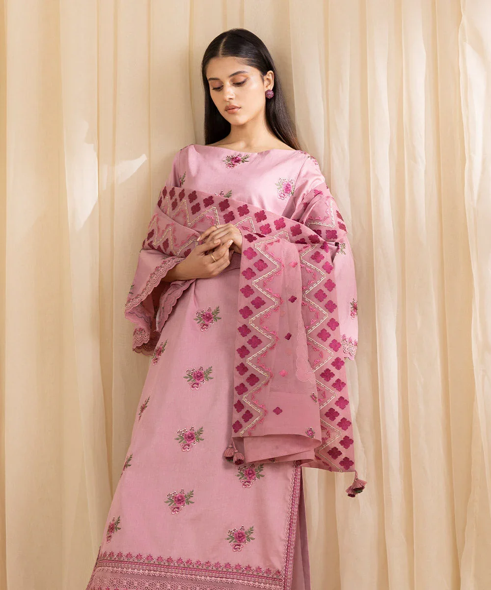 Make a graceful statement this festive season with this beautifully crafted three-piece embroidered ensemble by Sapphire. Designed in a soft pink hue, the outfit features a finely embroidered cotton satin shirt that offers a subtle sheen and a luxurious feel. It is paired with perfectly dyed trousers for a balanced and elegant look, while the lightweight pure chiffon dupatta adds effortless charm and fluidity. Ideal for festive gatherings, celebrations, or semi-formal occasions, this ensemble blends timeless sophistication with modern style.