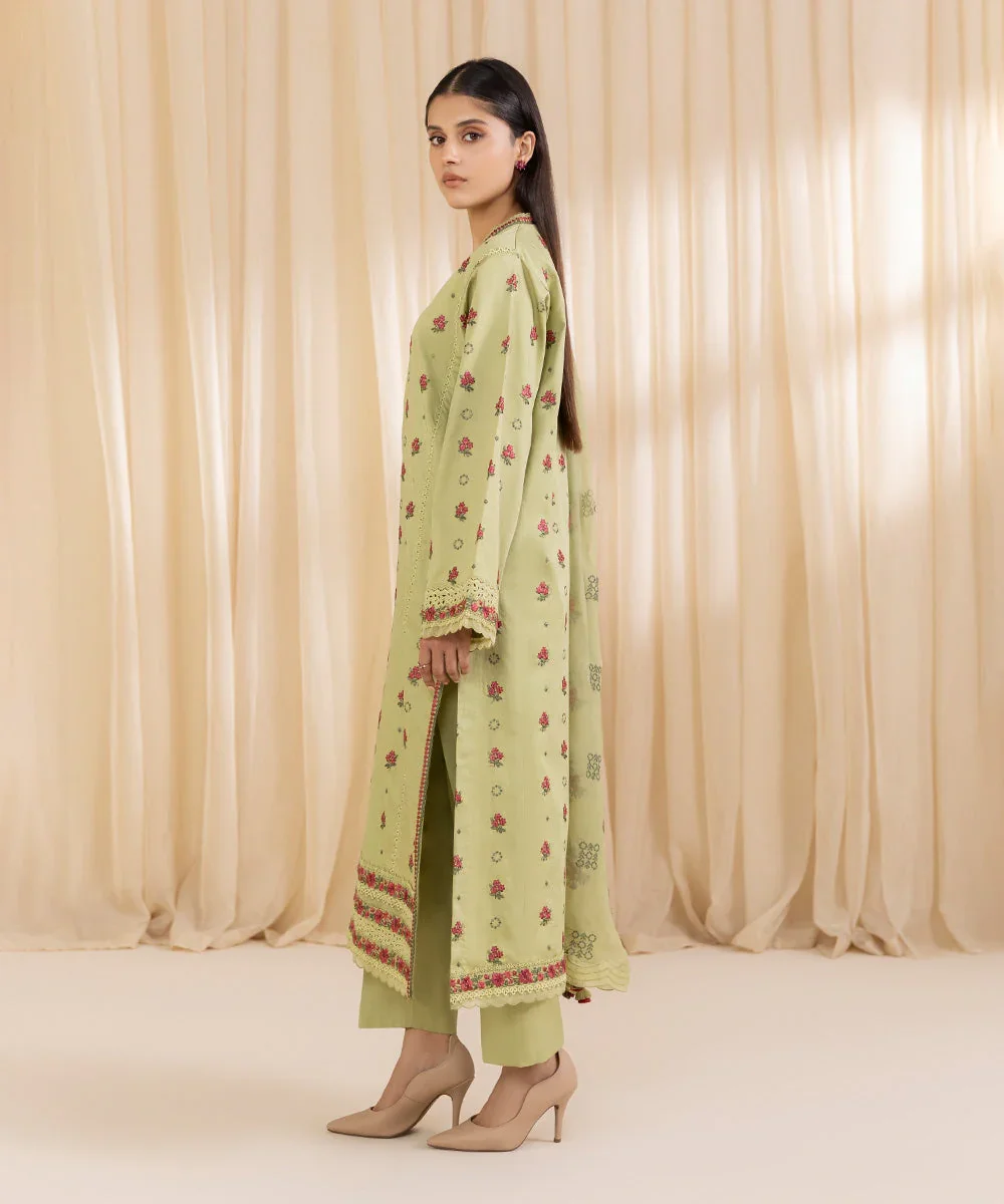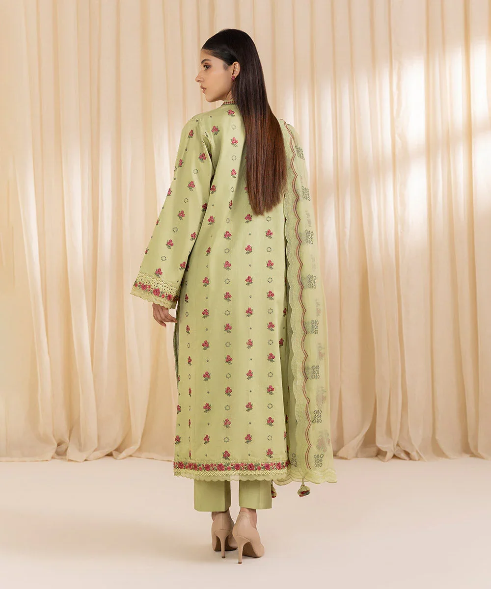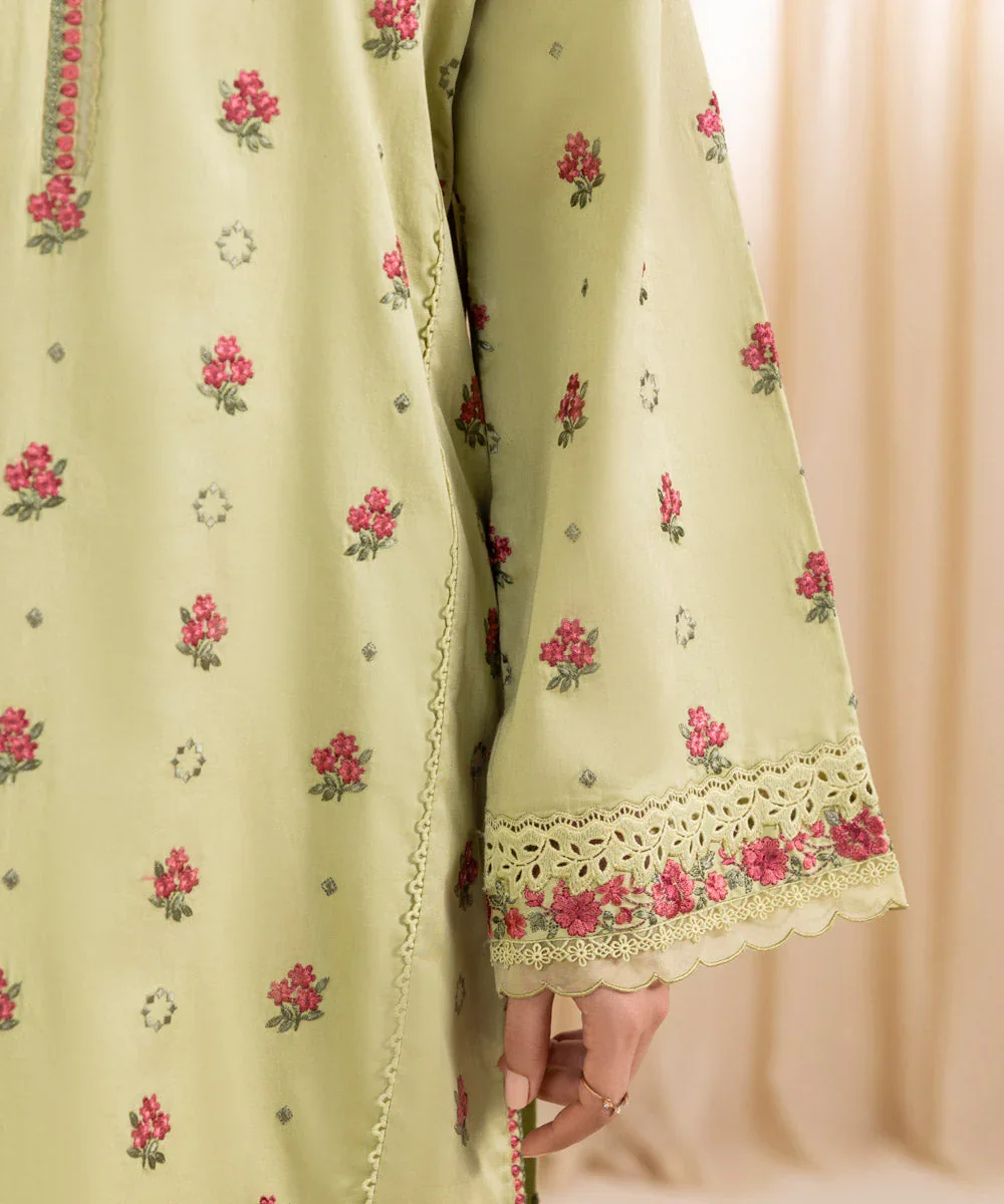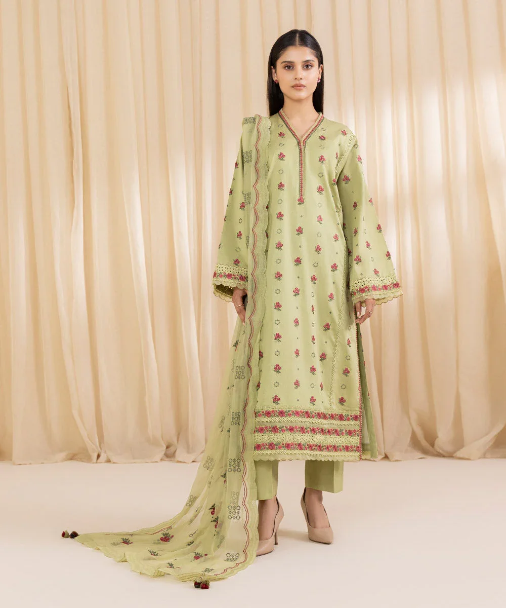 Make a graceful statement this festive season with our exquisitely crafted three-piece embroidered suit in a refreshing pistachio green hue. The finely embroidered cotton satin shirt offers a luxurious sheen and a soft, comfortable feel, making it ideal for both day and evening wear. Paired with elegantly dyed trousers and complemented by a lightweight pure chiffon dupatta, this ensemble strikes the perfect balance between sophistication and comfort. Designed for modern elegance, this outfit is a timeless addition to your festive and semi-formal wardrobe.