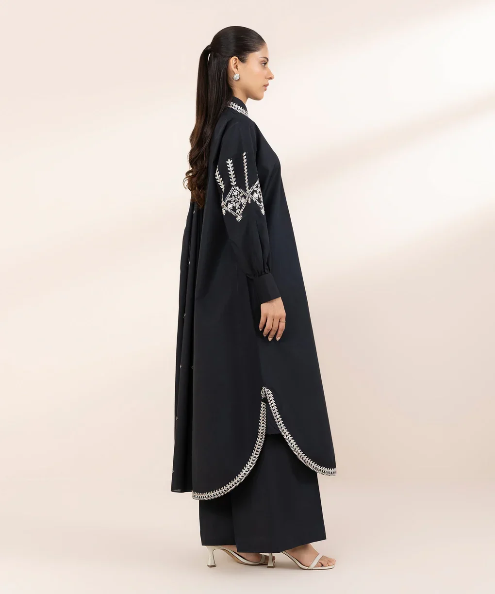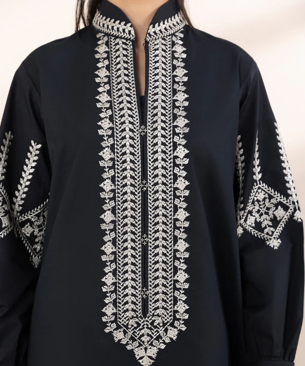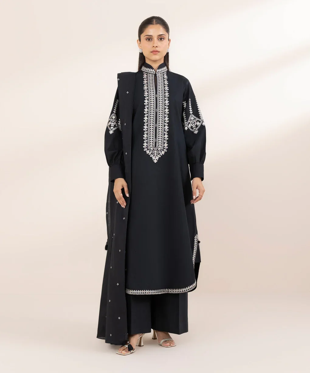 Make a timeless style statement with this elegant Sapphire 3-piece embroidered lawn suit. Designed in a classic black hue, the textured lawn shirt is beautifully enhanced with delicate embroidery, adding depth and sophistication to the look. It is perfectly paired with breathable cotton trousers for all-day comfort and a lightweight voile dupatta that adds a graceful finishing touch. Ideal for festive gatherings, casual evenings, or semi-formal occasions, this ensemble blends modern elegance with effortless wearability.