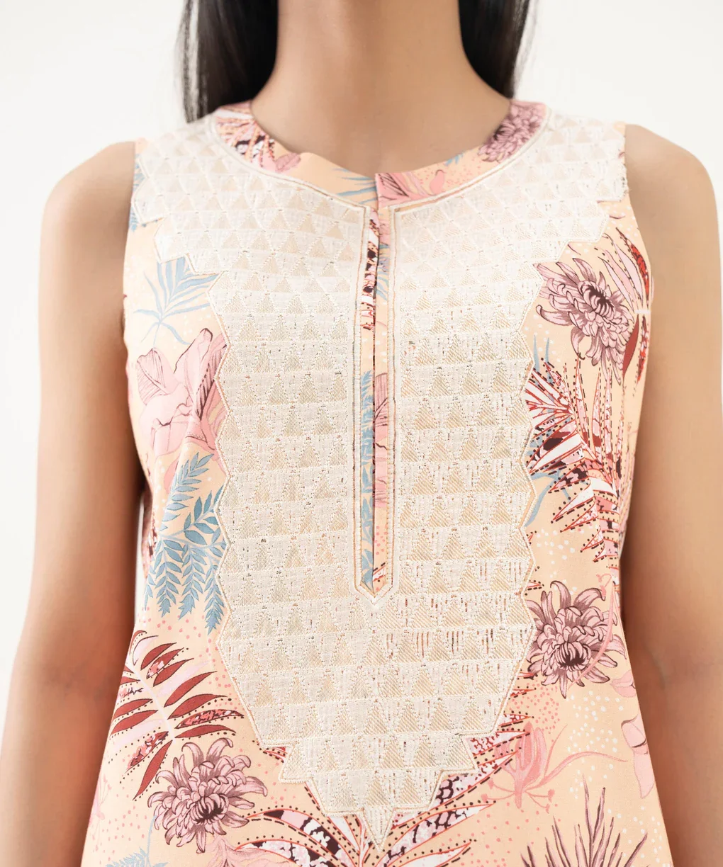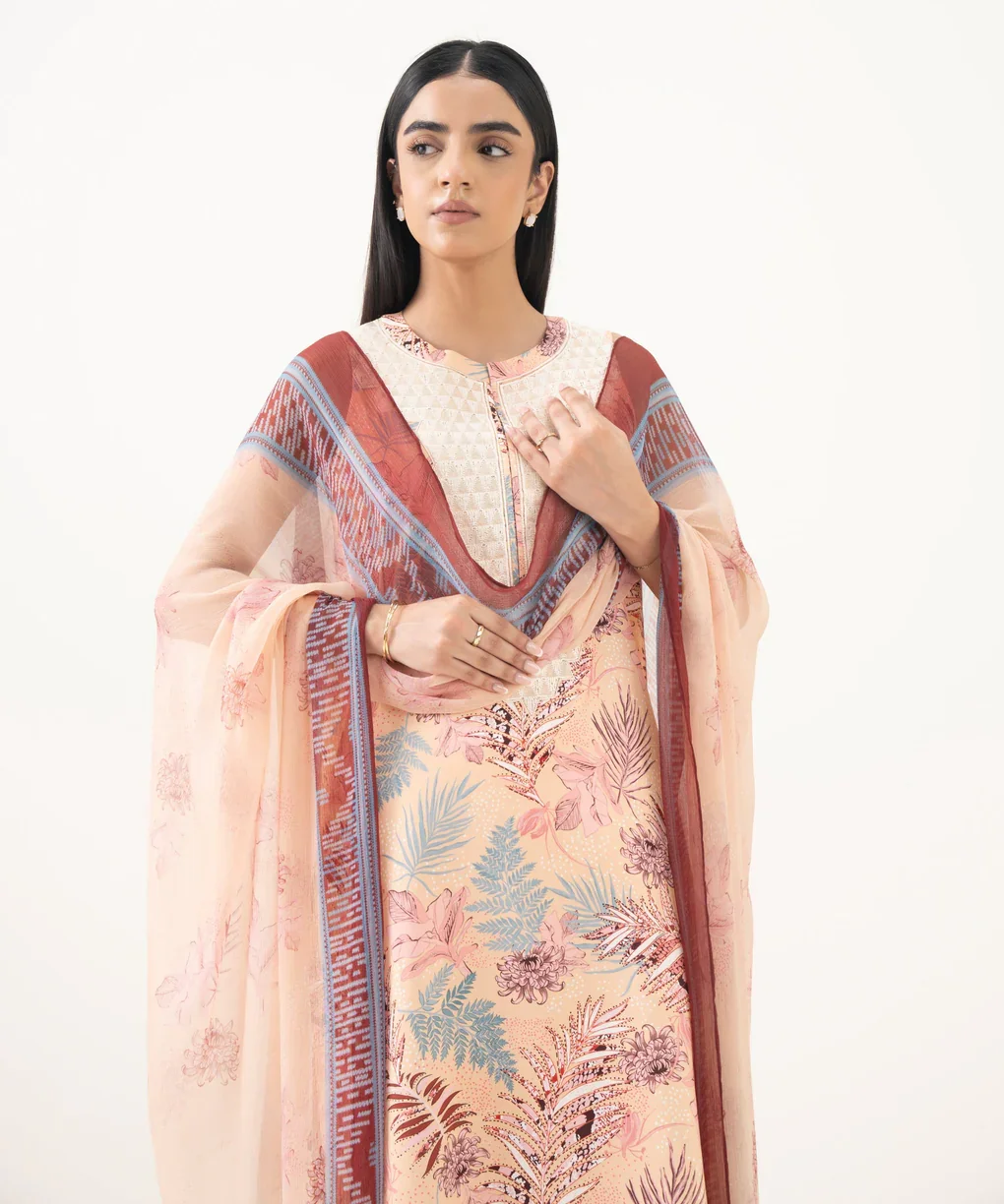 Elevate your everyday style with this elegant three-piece embroidered peach ensemble by Sapphire. Crafted from premium lawn fabric, the shirt features intricate embroidery that adds a touch of sophistication and charm. It is paired with comfortable cotton trousers for a relaxed yet polished look, while the lightweight blended chiffon dupatta completes the outfit with graceful flow and elegance. Perfect for casual wear, daytime gatherings, or festive occasions, this outfit blends comfort with timeless style.