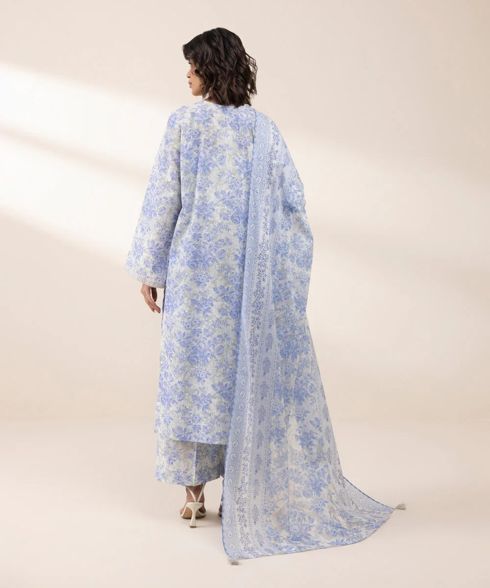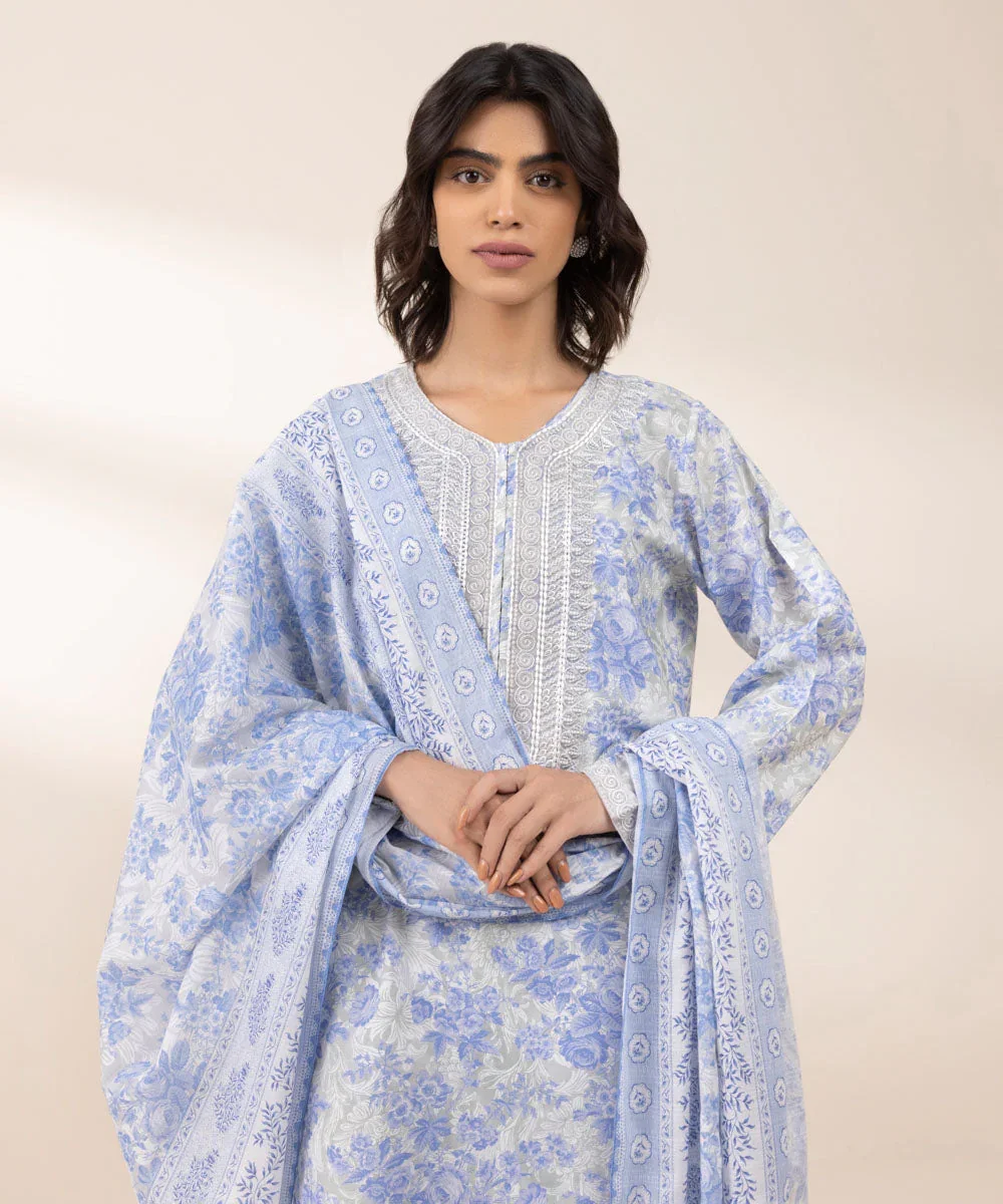 Elevate your seasonal wardrobe with this elegant Sapphire 3-piece embroidered lawn suit, designed to bring together sophistication and comfort. The beautifully crafted off-white lawn shirt features delicate embroidery in soothing light blue tones, creating a graceful and timeless look.