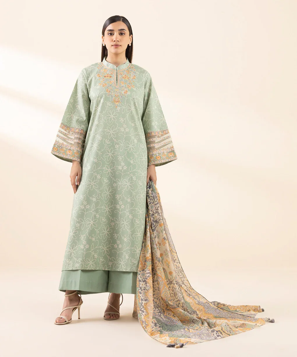 Elevate your wardrobe with our exquisite Sapphire 3-piece embroidered lawn suit in a soft pastel green. This elegant ensemble includes a delicately embroidered lawn shirt, paired with comfortable cotton trousers and a multicoloured voile dupatta that adds a touch of charm. Perfect for casual gatherings or festive occasions, this suit blends timeless style with all-day comfort.