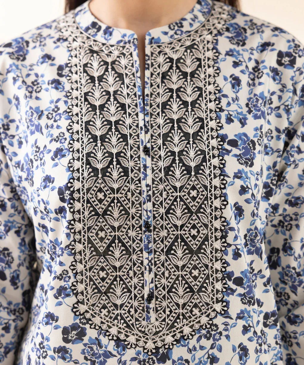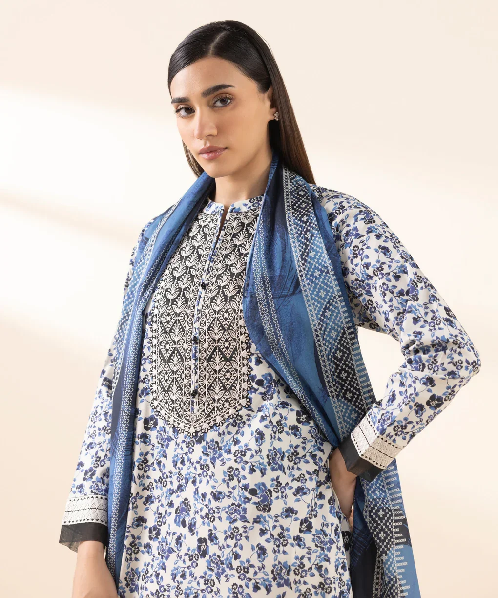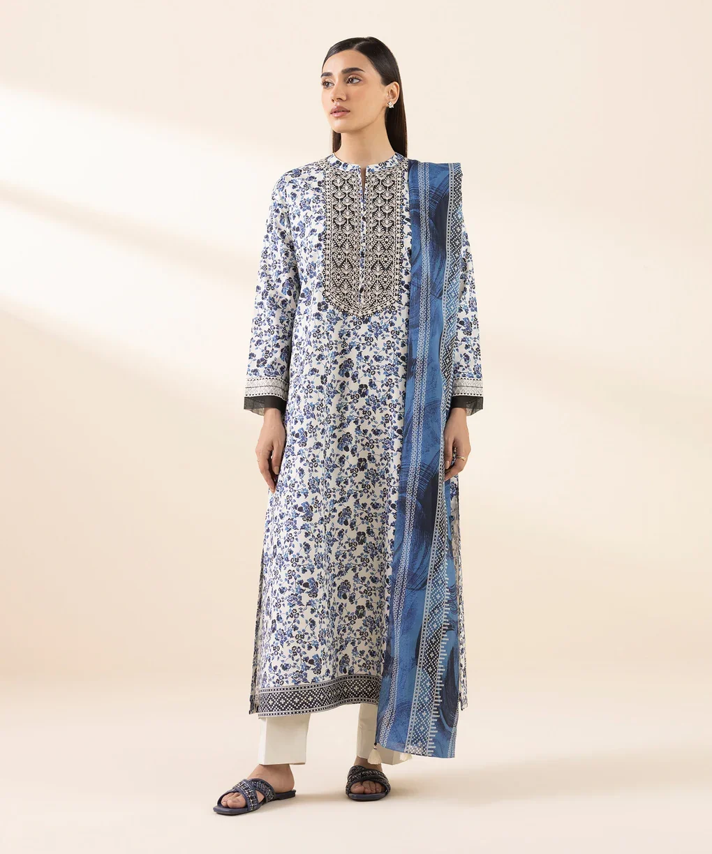 Elevate your wardrobe with the Sapphire 3-Piece Embroidered Lawn Ensemble, a perfect blend of elegance and comfort. This stunning set features a delicately embroidered off-white lawn shirt, paired with soft dyed cotton trousers for a comfortable fit, and a lightweight voile dupatta that completes the look. Ideal for casual gatherings or festive occasions, this ensemble promises effortless style and timeless charm.