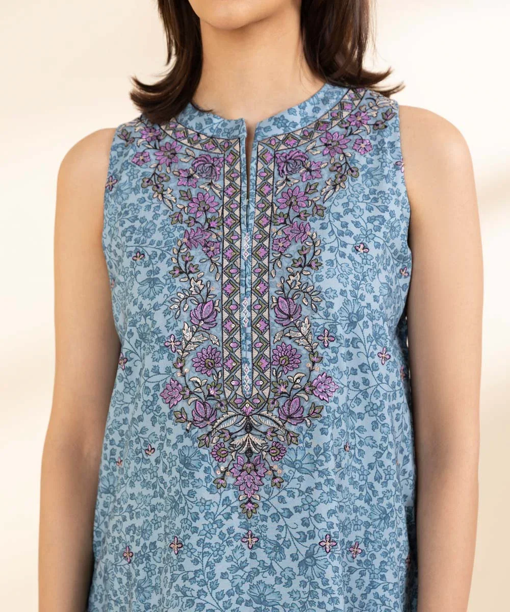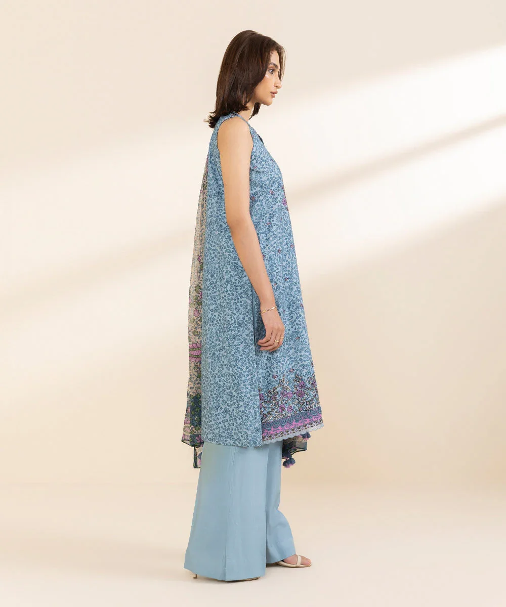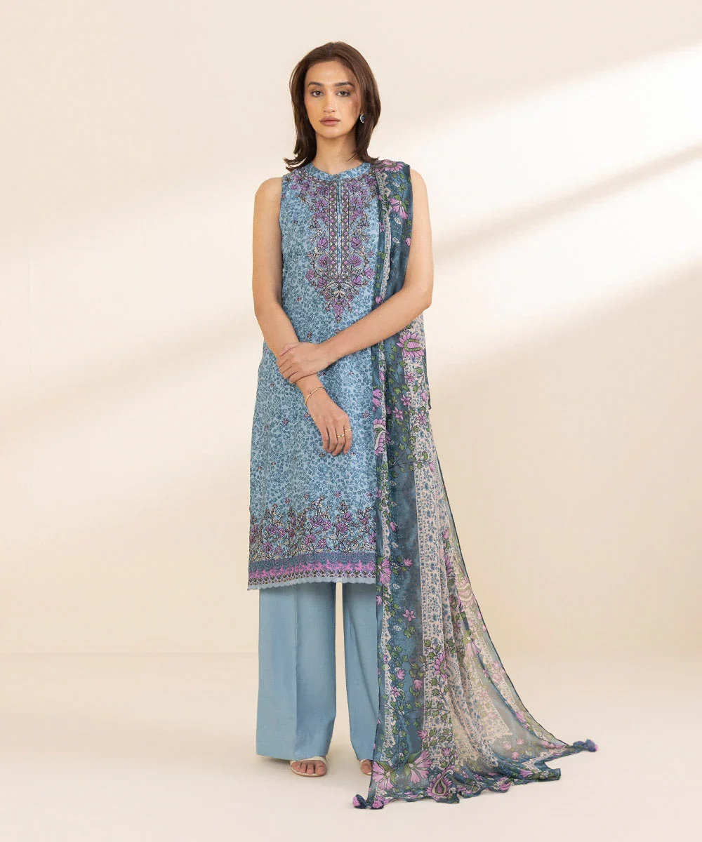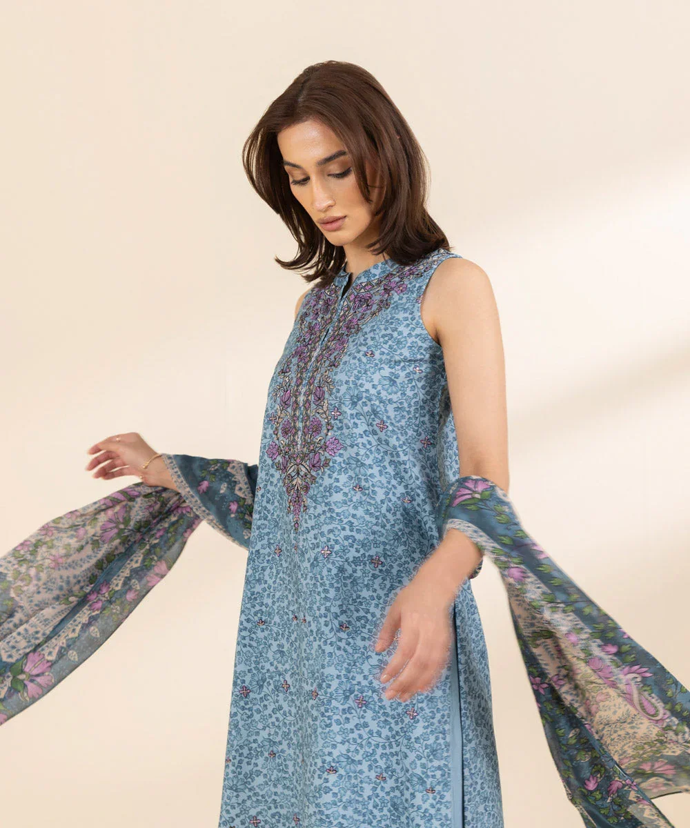 Elevate your wardrobe with the Sapphire 3-Piece Embroidered Linen Jacquard Suit. This stunning ensemble features an intricately embroidered ice-blue linen jacquard shirt paired with matching trousers, offering both style and comfort. The look is perfectly complemented by a vibrant multicoloured viscose chiffon dupatta, adding a touch of sophistication and charm. Ideal for festive occasions or elegant daytime events, this three-piece suit combines timeless elegance with contemporary design.