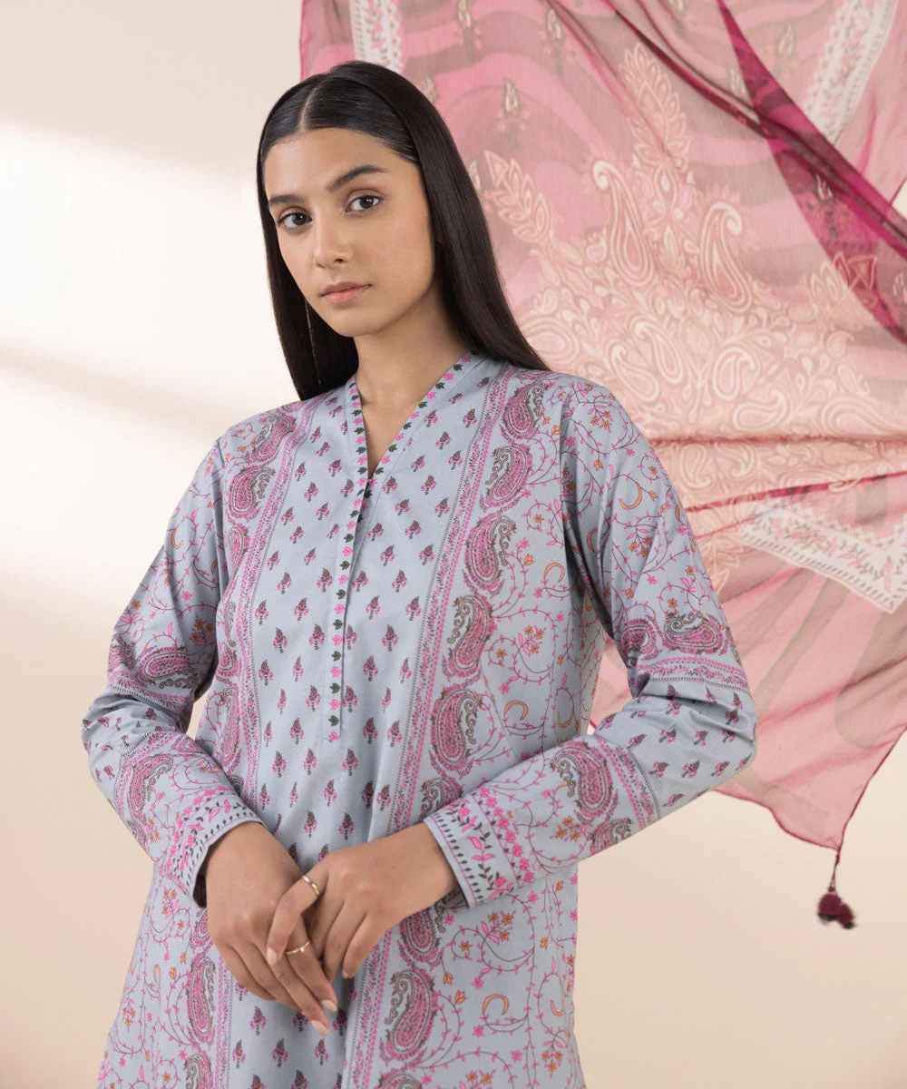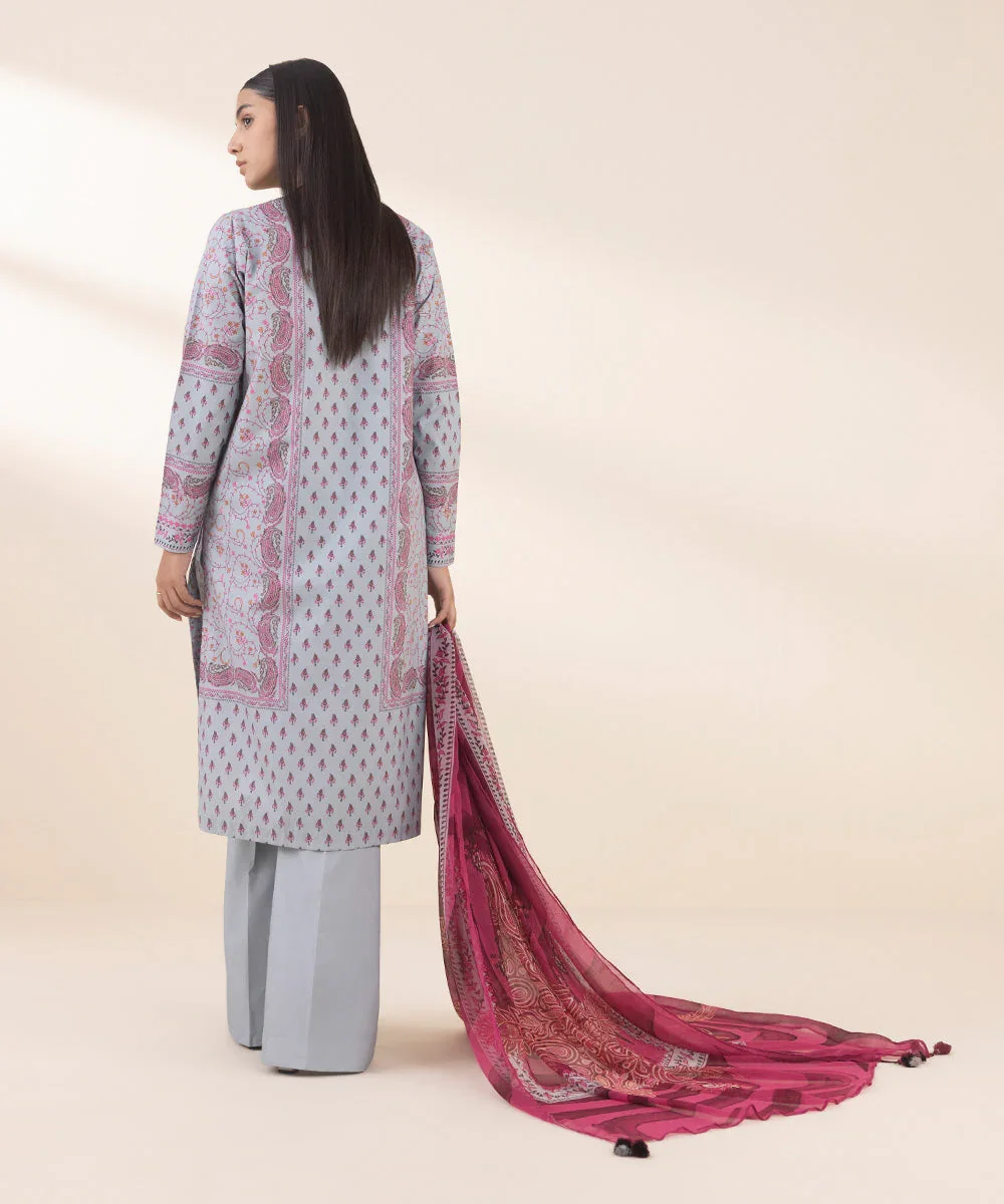 Elevate your everyday style with this elegant 3-piece printed cotton suit, featuring a light blue shirt and trousers, perfectly complemented by a matching dark fuchsia blended chiffon dupatta. Designed for comfort and effortless sophistication, this ensemble is ideal for casual wear and semi-formal occasions