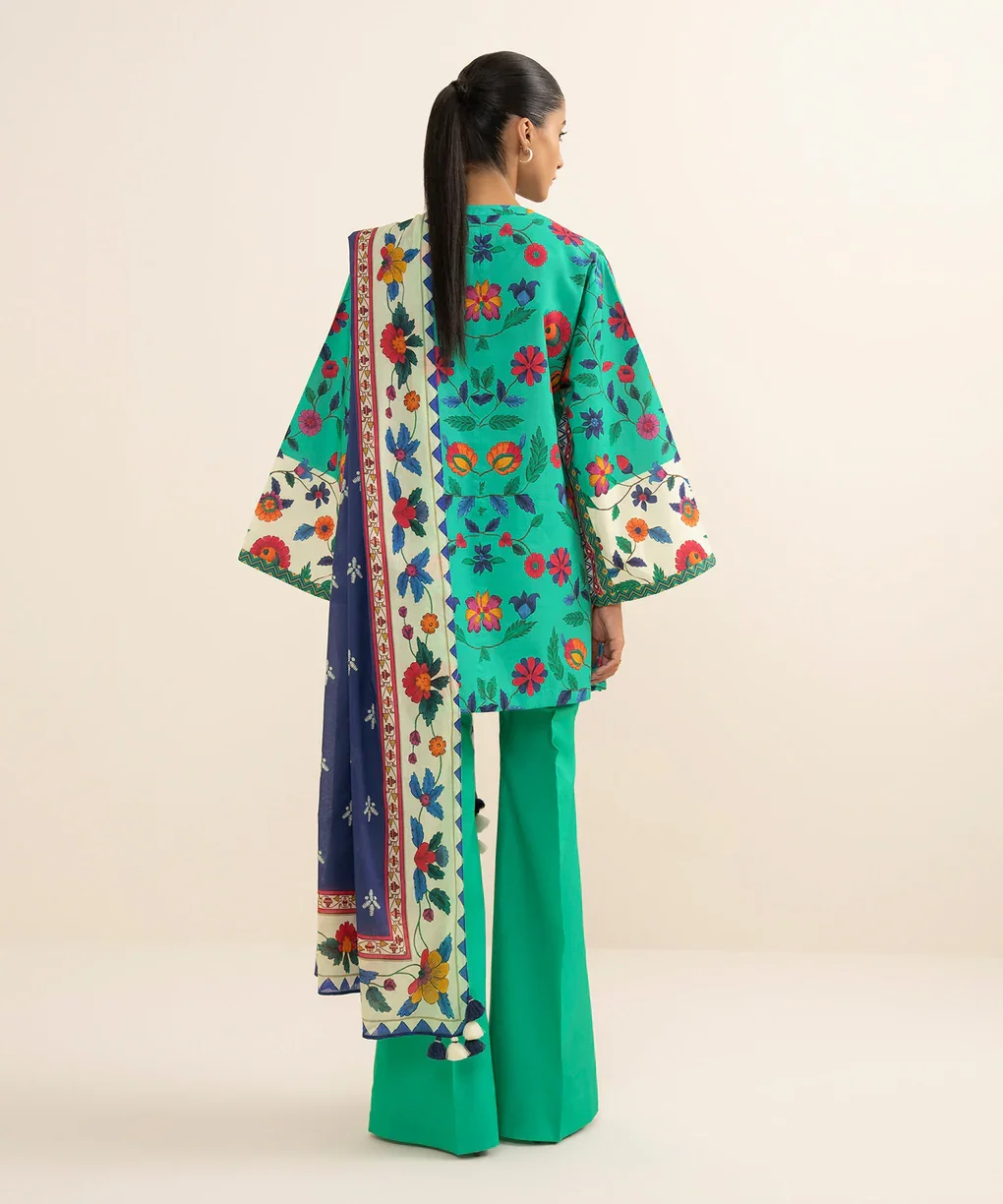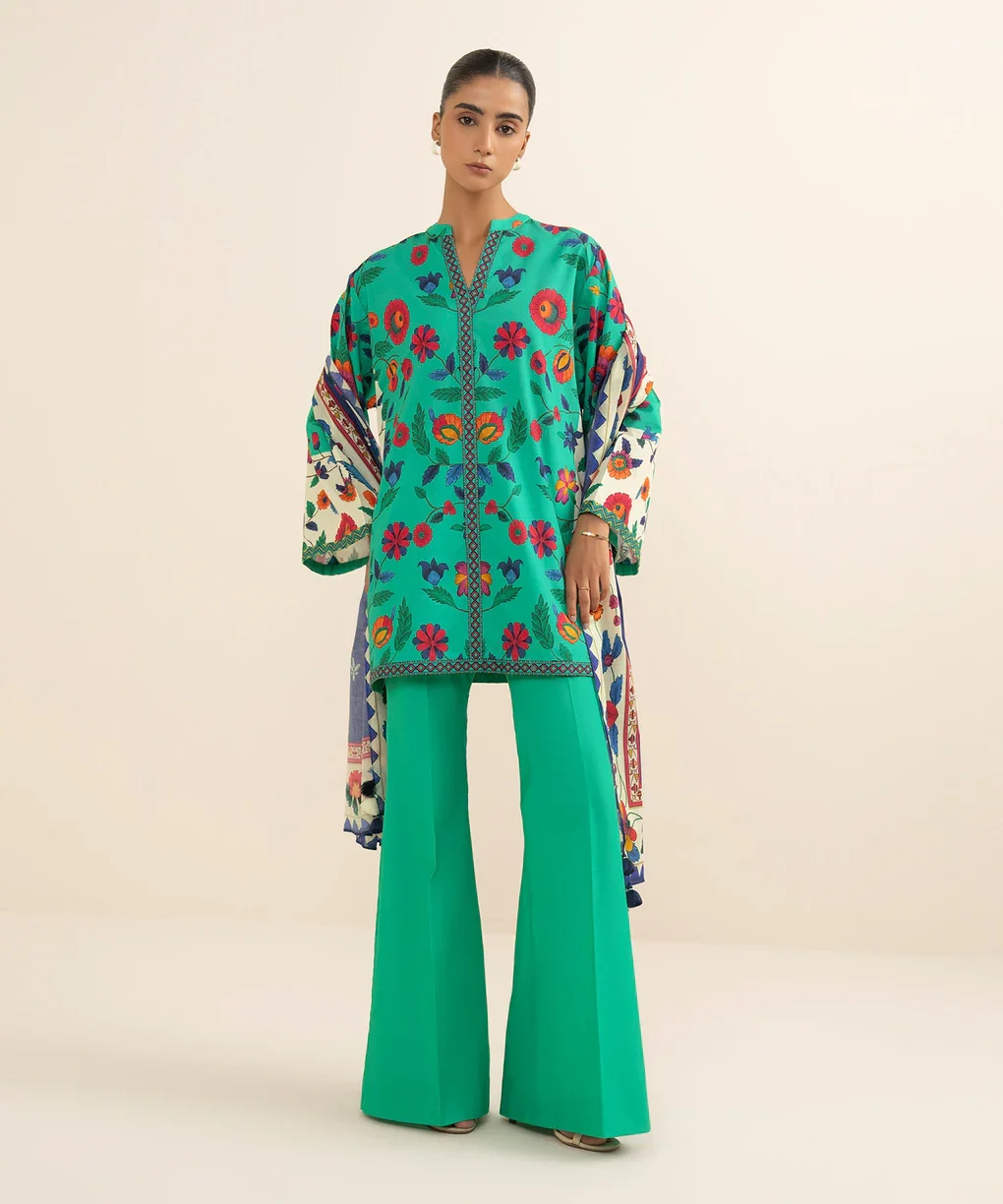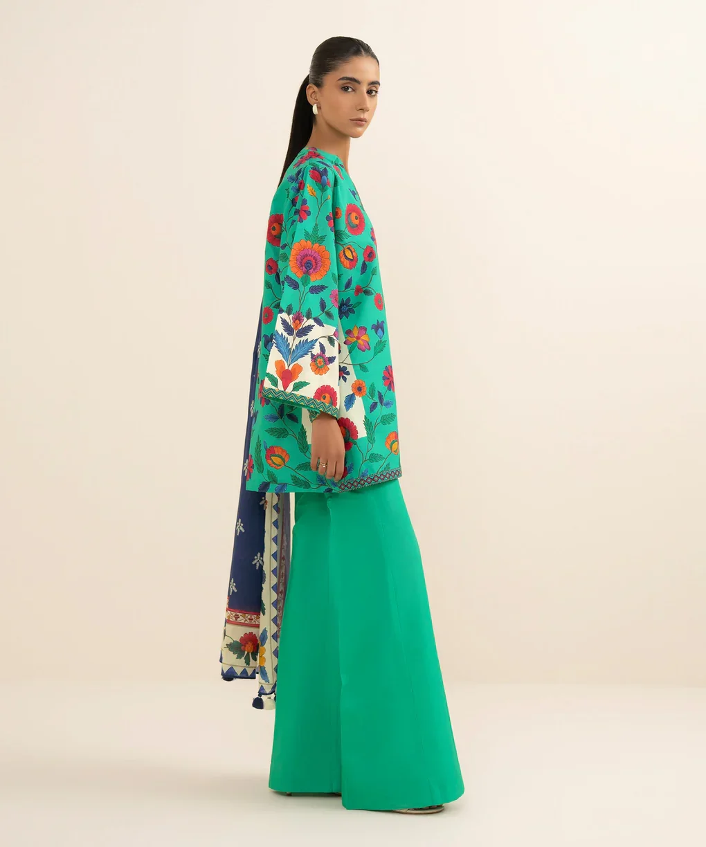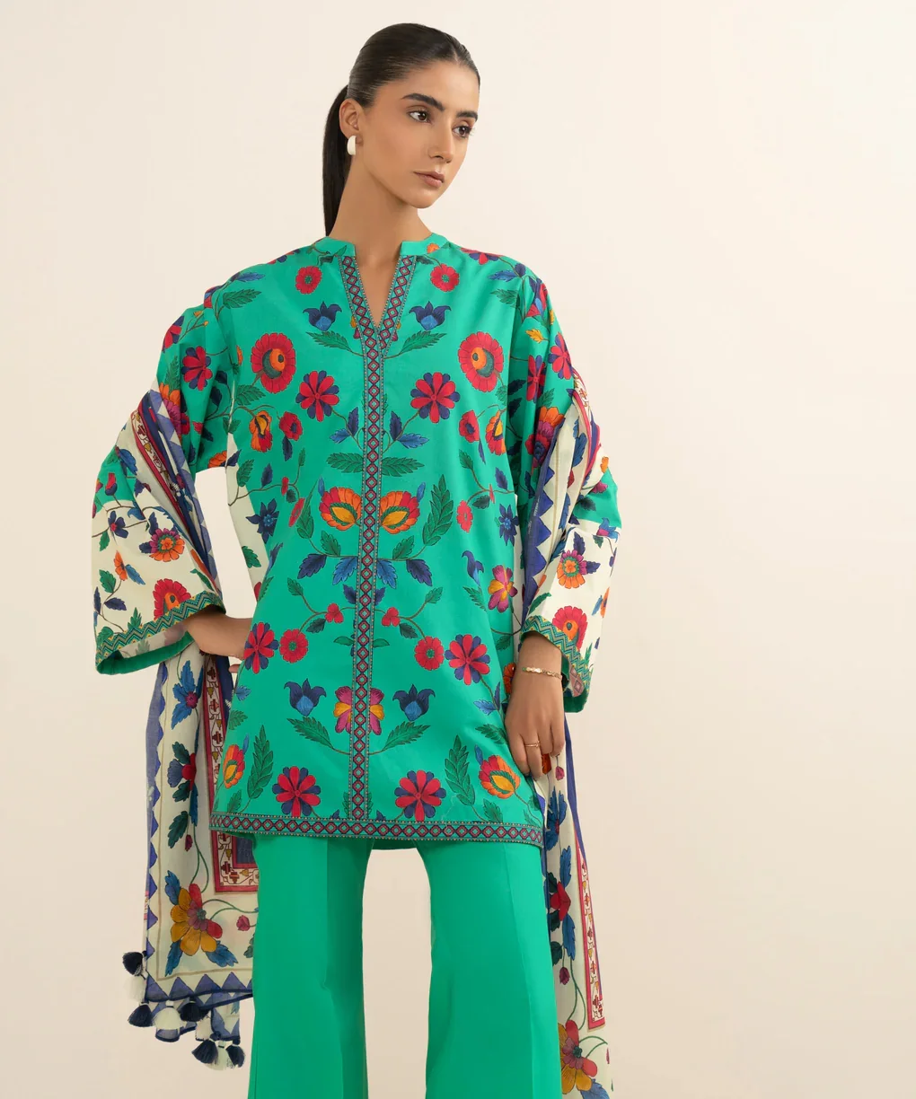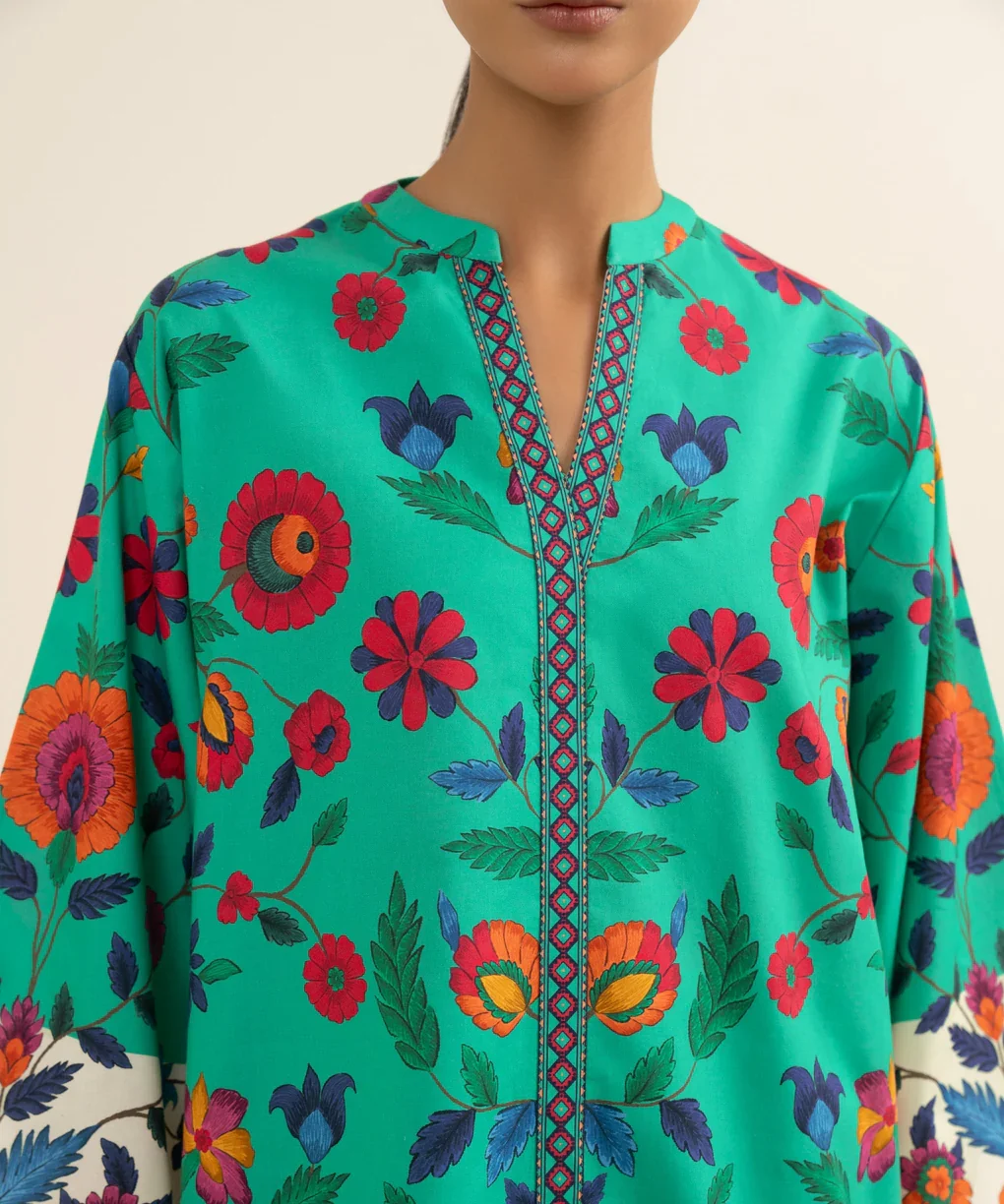 Step into effortless elegance with the Sapphire 3-Piece Printed Cotton Suit. This stunning ensemble features a lightweight off-white cotton shirt adorned with delicate sage green prints, paired with dyed cotton trousers for ultimate comfort. The airy voile dupatta completes the look, adding a touch of grace and sophistication. Perfect for casual outings, festive occasions, or semi-formal gatherings, this suit blends style, comfort, and timeless charm.
