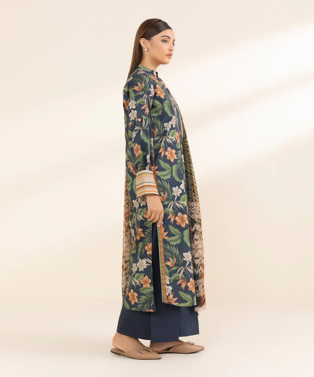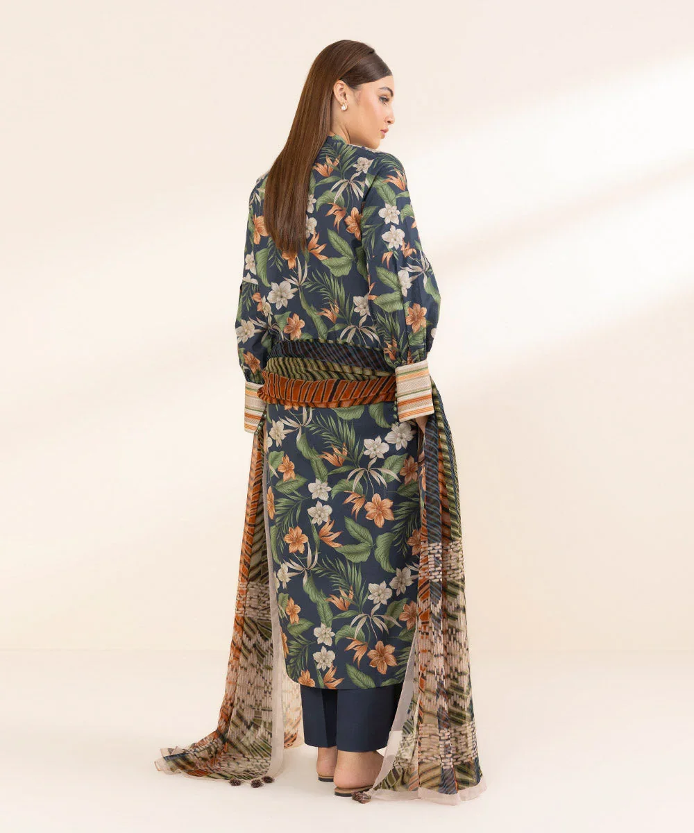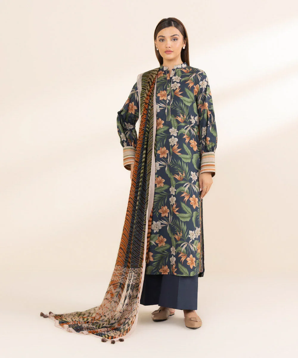 Refresh your wardrobe this season with the Sapphire Elegance 3-piece printed lawn suit. Featuring a rich dark blue base adorned with vibrant multi-coloured prints, this ensemble combines style and comfort effortlessly. The suit includes a soft lawn shirt, breathable cotton trousers, and a flowing blended chiffon dupatta that completes the look with grace. Perfect for casual gatherings or festive occasions, this suit ensures you step out with confidence and timeless elegance.