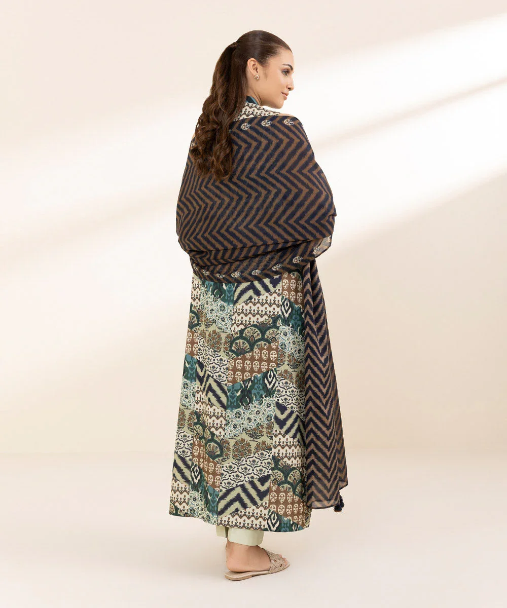 Refresh your wardrobe with this elegant Sapphire 3-piece printed lawn suit, designed for effortless style and comfort. The outfit features a vibrant multicoloured lawn shirt that adds a lively touch to your look, paired with soft and breathable cotton trousers for all-day ease. Completing the ensemble is a beautifully crafted navy blue and brown voile dupatta, adding a graceful and sophisticated finish. Perfect for casual outings, summer gatherings, and everyday wear, this outfit blends modern design with timeless charm.
