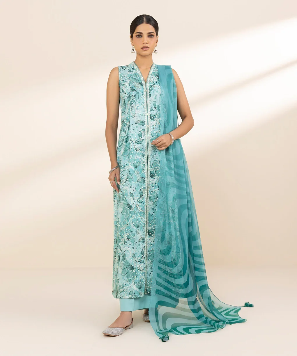 Elevate your everyday style with this elegant Sapphire 3-piece printed lawn suit in a refreshing aqua shade. The beautifully designed lawn shirt features eye-catching prints that add a touch of sophistication and charm. Paired with soft, breathable dyed cotton trousers, it ensures all-day comfort without compromising on style.